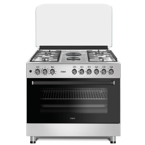 MIKA standing cooker, 90cm x 60cm, 4 gas pool jet burners + 2 rapid hot plates, flame failure safety, auto ignition, 10 function full 90cm electric oven (air fry + convection fan).